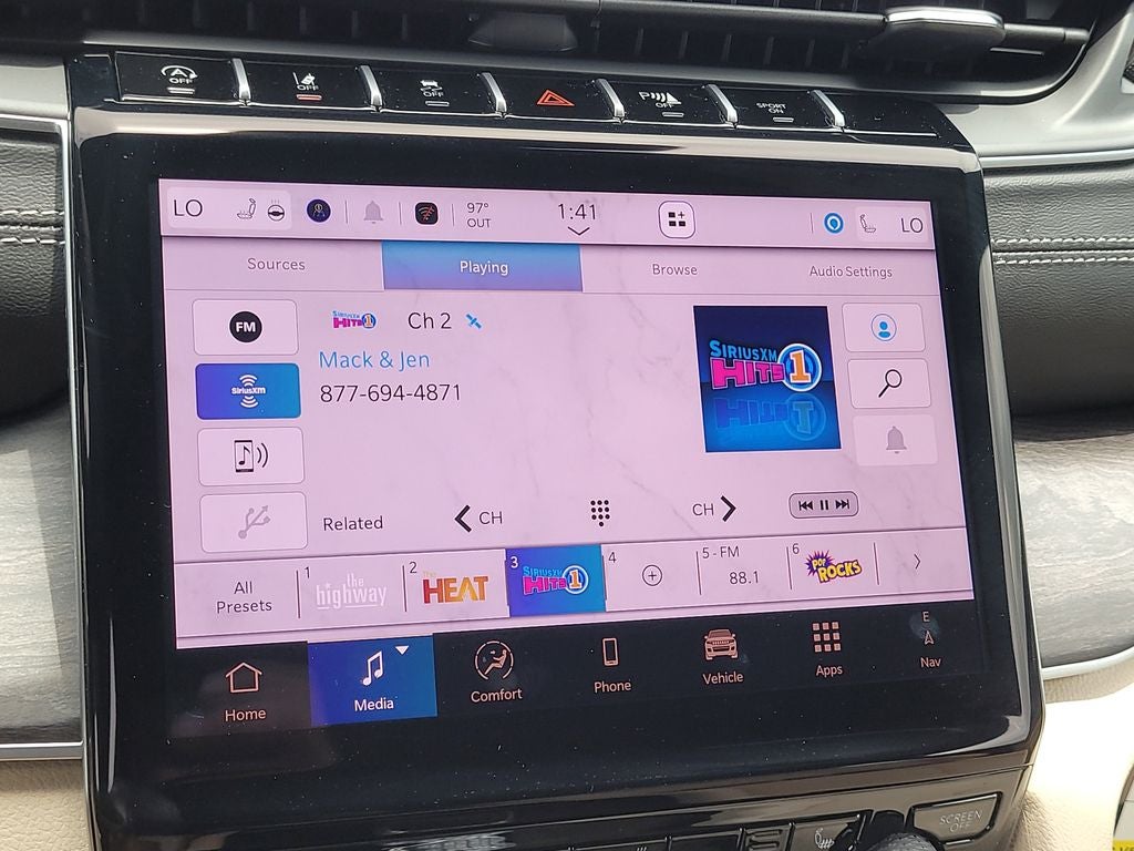 19/26 City/Highway MPG Quick Order Package 22E, Trailer Tow Package (220 Amp Alternator, 7 and 4-Pin Wiring Harness, Automatic Headlamp Levelling System, Class IV Receiver Hitch, Heavy-Duty Engine Cooling, Rear Load Levelling Suspension, and Trailer Hitch Zoom), 4-Wheel Disc Brakes, 506 Watt Amplifier, 6 Speakers, 9 Amplified Speakers with Subwoofer, ABS brakes, Active Noise Control System, Air Conditioning, Alloy wheels, AM/FM radio: SiriusXM with 360L, Anti-whiplash front head restraints, Audio memory, Auto High-beam Headlights, Automatic temperature control, Brake assist, Bumpers: body-color, Capri Leatherette Seats, Compass, Delay-off headlights, Driver door bin, Driver vanity mirror, Dual front impact airbags, Dual front side impact airbags, Dual-Pane Panoramic Sunroof, Electronic Stability Control, Emergency communication system, Four wheel independent suspension, Front anti-roll bar, Front Bucket Seats, Front Center Armrest w/Storage, Front dual zone A/C, Front fog lights, Front License Plate Bracket, Front reading lights, Fully automatic headlights, Garage door transmitter, Heated door mirrors, Heated front seats, Heated rear seats, Heated steering wheel, Illuminated entry, Knee airbag, Low tire pressure warning, Memory seat, Model Year Tracking, Navigation System, Normal Duty Suspension, Occupant sensing airbag, Outside temperature display, Overhead airbag, Overhead console, Panic alarm, ParkView Rear Back-Up Camera, Passenger door bin, Passenger vanity mirror, Power door mirrors, Power driver seat, Power Liftgate, Power passenger seat, Power steering, Power windows, Radio data system, Radio: Uconnect 5 Nav with 10.1 Display, Rear anti-roll bar, Rear reading lights, Rear window defroster, Rear window wiper, Remote keyless entry, Security system, Speed control, Speed-Sensitive Wipers, Split folding rear seat, Spoiler, Steering wheel mounted audio controls, Tachometer, Telescoping steering wheel, Tilt steering wheel, Traction control, Trip computer, Turn signal indicator mirrors, Variably intermittent wipers, Voltmeter, Wheels: 18 x 8 Polished/Painted Aluminum, and Wheels: 20 x 8.5 Machined/Painted Aluminum.