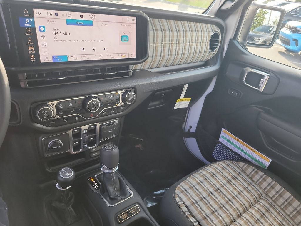Quick Order Package 22F 85th Anniversary Edition (2-Door Passive Entry, Front Door Locks, 85th Anniversary Group, 85th Cupholder Plaque, 85th Fender Decal, 85th Shifter Medallion, 85th Tailgate Decal, 85th Wrangler Hood Decal, Adaptive Cruise Control with Stop, Advanced Brake Assist, Air Conditioning with Auto Temp Control, Air Filtering, Alpine Premium Audio System, Anti-Lock 4-Wheel Disc Brakes, Automatic Headlamps, Berber Cargo Mats, Berber Floor Mats, Body Color Fenders Flares, Bronze Tow Hooks, Central ADAS Decision Module (CADM), Cloth Seat with Plaid Insert and Tag, Cluster 7.0 TFT Color Display, Corning Gorilla Glass, Daytime Running Lamps LED Accents, Deep Tint Sunscreen Windows, Emergency/Assistance Call, Front LED Fog Lamps, Full Speed Forward Collision Warning Plus, Gray/Bronze Trail Rated Badge, Heated Front Seats, Heated Steering Wheel, LED Premium Reflector Headlamps, Mayan Gold Interior Accents, Plaid Wrap Instrument Panel Mid-Bolster, Power Heated Mirrors, Premium Wrapped Steering Wheel, Security Alarm, Sun Visors with Illuminated Vanity Mirrors, Universal Garage Door Opener, and Wheels: 17 x 7.5 Steel Oxide), Safety Group (Auto High Beam Headlamp Control, Blind Spot and Cross Path Detection, Injection Molded Black Rear Bumper, LED Taillamps, and ParkSense Rear Park Assist System), Trailer Tow and Auxiliary Switch Group (7 and 4 Pin Wiring Harness, Auxiliary Switches, and Class II Receiver Hitch), 12.3 Touchscreen Display, 3.45 Overall Top Gear Ratio, 4-Wheel Disc Brakes, 4G LTE Wi-Fi Hot Spot, 8 Speakers, ABS brakes, Air Conditioning, AM/FM radio: SiriusXM with 360L, Apple CarPlay, Apple CarPlay/Android Auto, Aux Battery, Brake assist, Compass, Connectivity - US/Canada, Delay-off headlights, Driver door bin, Driver vanity mirror, Dual front impact airbags, Dual front side impact airbags, Electronic Stability Control, For More Info, Call 800-643-2112, Front anti-roll bar, Front Bucket Seats, Front Center Armrest w/Storage, Front fog lights, Front reading lights, Google Android Auto, Illuminated entry, Integrated Center Stack Radio, Integrated roll-over protection, Jeep Trail Rated Kit, Low tire pressure warning, Manufacture Statement of Origin, MOPAR Stainless Door Sill Guards, Non-Lock Fuel Cap Without Discriminator, Normal Duty Suspension, Occupant sensing airbag, Outside temperature display, Overhead airbag, Panic alarm, ParkView Rear Back-Up Camera, Passenger door bin, Passenger vanity mirror, Power steering, Power Top Quarter Window Storage Bag, Power windows, Radio data system, Radio: Uconnect 5 with 12.3 Display, Rear anti-roll bar, Rear reading lights, Rear Window Defroster, Rear Window Wiper/Washer, Remote keyless entry, Removable Rear Quarter Windows, SiriusXM Radio Service, SiriusXM with 360L, Sky One-Touch Power Top, Speed control, Split folding rear seat, Steering wheel mounted audio controls, Stop-Start Dual Battery System, Tachometer, Telescoping steering wheel, Tilt steering wheel, Traction control, Trip computer, Variably intermittent wipers, and Wheels: 17 x 7.5 Black Steel Styled.