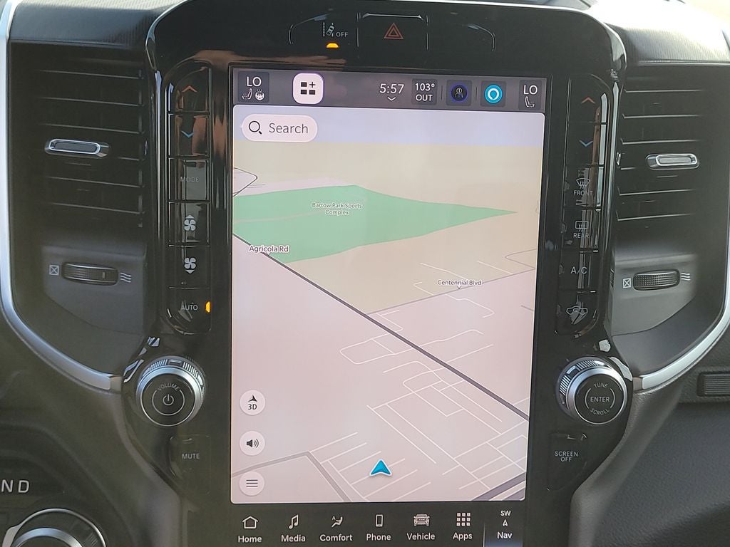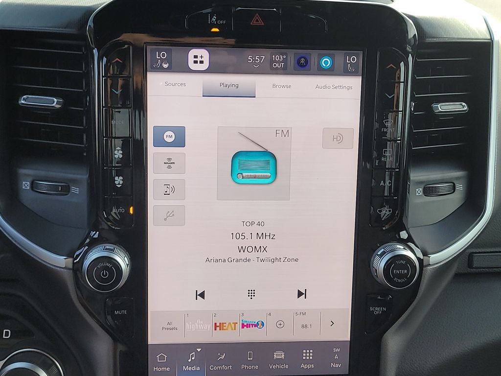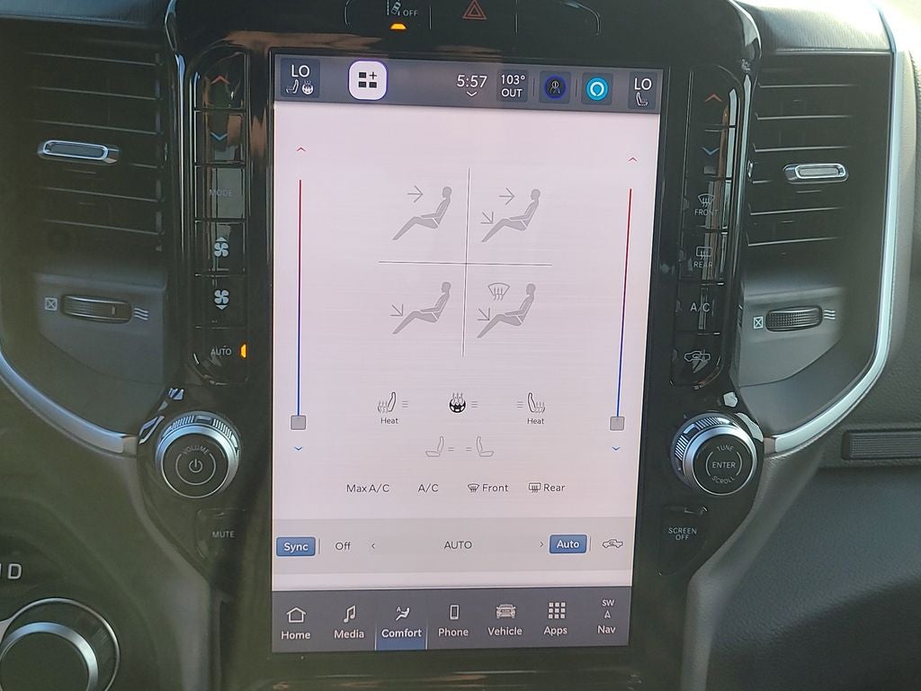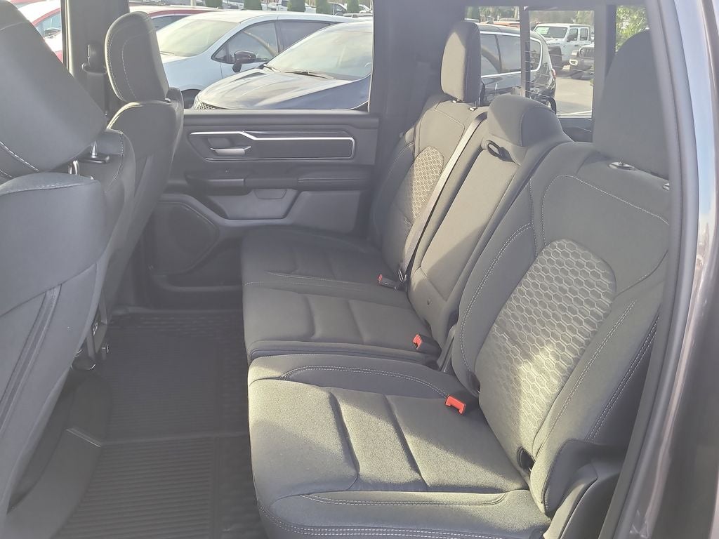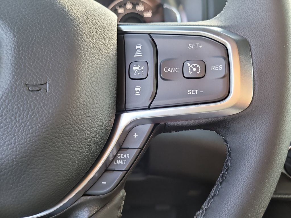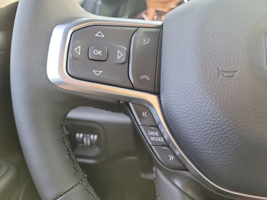 Big Horn Level 2 Equipment Group (115V Auxiliary Power Outlet, 115V Auxiliary Rear Power Outlet, 12 Touchscreen Display, 2nd Row in Floor Storage Bins, 3 Rear Seat Head Restraints, 4 Way Front Headrests, 400W Inverter, 4G LTE Wi-Fi Hot Spot, 9 Amplified Speakers with Subwoofer, Air Conditioning ATC with Dual Zone Control, Apple CarPlay, Auto Power-Folding Mirrors, Auto-Dimming Exterior Driver Mirror, Auto-Dimming Rear-View Mirror, Black Exterior Mirrors, Black Premium Power Mirrors, Body Color Fender Flares, Bucket Seats, Center Console Parts Module, Cluster 7.0 TFT Color Display, Configurable Drive Mode, Connected Travel and Traffic Services, Connectivity - US/Canada, Convex Wide-Angle Exterior Mirror Insert, Deluxe Cloth Bucket Seats, Disassociated Touchscreen Display, Exterior Mirrors Courtesy Lamps, Exterior Mirrors with Heating Element, Exterior Mirrors with Supplemental Signals, Front Seat Back Map Pockets, Full Length Floor Console, Global Telematics Box Module, Glove Box Lamp, Google Android Auto, GPS Antenna Input, GPS Navigation, HD Radio, Heated Front Seats, Heated Steering Wheel, Integrated Center Stack Radio, Integrated Voice Command with Bluetooth®, Leather Wrapped Steering Wheel, LED Dome Lamp with on/Off Switch, LED Footwell Lighting, Manual Adjust 4-Way Front Passenger Seat, Media Hub with 2 Charge Only USBs, Overhead LED Lamps, Power 2-Way Driver Lumbar Adjust, Power Adjust 8-Way Driver Seat, Power Adjustable Pedals, Premium Overhead Console, Radio: Uconnect 5 Navigation with 12.0 Display, Rear 60/40 Folding Seat, Rear Center Armrest, Rear Power Sliding Window, Rear Window Defroster, Remote Tailgate Release, Security Alarm, SiriusXM Radio Service, SiriusXM with 360L, Steering Wheel Mounted Audio Controls, Sun Visors with Illuminated Vanity Mirrors, Universal Garage Door Opener, and USB Host Flip), Night Edition (Accent Color Door Handles, Accent Color Premium Power Mirrors, Accent Color Tailgate Handle, Anti-Spin Differential Rear Axle, Black Exterior Truck Badging, Black Headlamp Bezels, Black Interior Accents, Black Painted Exterior Mirrors Caps, Black Tail Lamp Bezels, Body Color Front Bumper, Body Color Rear Bumper with Step Pads, Dual Exhaust with Black Tips, Grille Black Surround Black Mesh, RAM Grille Badge - Black, and Wheels: 20 x 9.0 Aluminum Painted Clad), Quick Order Package 21Z Big Horn, 4-Wheel Disc Brakes, 48V Belt Starter Generator, 6 Speakers, ABS brakes, Air Conditioning, Alloy wheels, AM/FM radio, Apple CarPlay/Android Auto, Auto High-beam Headlights, Brake assist, Bumpers: chrome, Cloth Bucket Seats, Cluster 12 TFT Color Display, Compass, Delay-off headlights, Driver door bin, Dual front impact airbags, Dual front side impact airbags, Electronic Stability Control, Front anti-roll bar, Front Bucket Seats, Front Center Armrest w/Storage, Front fog lights, Front reading lights, Front wheel independent suspension, Fully automatic headlights, Heated door mirrors, Illuminated entry, Low tire pressure warning, Manual Adjust 4-Way Driver Seat, Manual Folding Exterior Mirrors, MOPAR Front and Rear Rubber Floor Mats, Occupant sensing airbag, Outside temperature display, Overhead airbag, Overhead console, Panic alarm, ParkView Rear Back-Up Camera, Passenger door bin, Passenger vanity mirror, Power door mirrors, Power steering, Power windows, Radio data system, Radio: Uconnect 5 W with 8.4 Display, RAM Grille Badge - Chrome, Rear anti-roll bar, Rear step bumper, Rear Wheelhouse Liners, Remote keyless entry, Speed control, Supplier Part Tracking (J-1), Tachometer, Telescoping steering wheel, Tilt steering wheel, Traction control, Trip computer, Variably intermittent wipers, and Voltmeter.