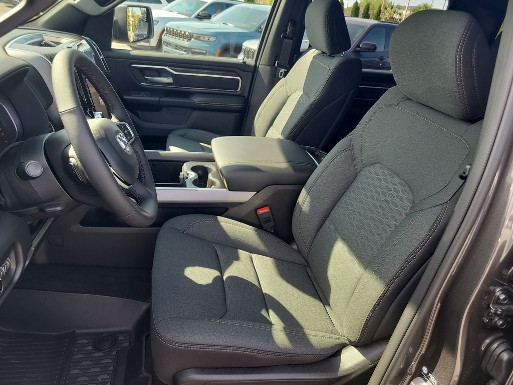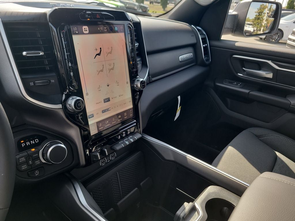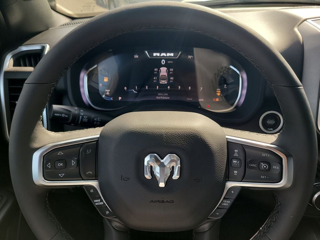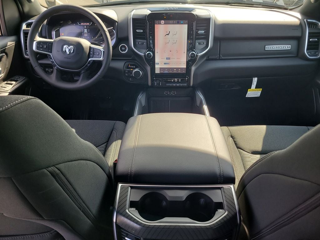 Big Horn Level 2 Equipment Group (115V Auxiliary Power Outlet, 115V Auxiliary Rear Power Outlet, 12 Touchscreen Display, 2nd Row in Floor Storage Bins, 3 Rear Seat Head Restraints, 4 Way Front Headrests, 400W Inverter, 4G LTE Wi-Fi Hot Spot, 9 Amplified Speakers with Subwoofer, Air Conditioning ATC with Dual Zone Control, Apple CarPlay, Auto Power-Folding Mirrors, Auto-Dimming Exterior Driver Mirror, Auto-Dimming Rear-View Mirror, Black Exterior Mirrors, Black Premium Power Mirrors, Body Color Fender Flares, Bucket Seats, Center Console Parts Module, Cluster 7.0 TFT Color Display, Configurable Drive Mode, Connected Travel and Traffic Services, Connectivity - US/Canada, Convex Wide-Angle Exterior Mirror Insert, Deluxe Cloth Bucket Seats, Disassociated Touchscreen Display, Exterior Mirrors Courtesy Lamps, Exterior Mirrors with Heating Element, Exterior Mirrors with Supplemental Signals, Front Seat Back Map Pockets, Full Length Floor Console, Global Telematics Box Module, Glove Box Lamp, Google Android Auto, GPS Antenna Input, GPS Navigation, HD Radio, Heated Front Seats, Heated Steering Wheel, Integrated Center Stack Radio, Integrated Voice Command with Bluetooth®, Leather Wrapped Steering Wheel, LED Dome Lamp with on/Off Switch, LED Footwell Lighting, Manual Adjust 4-Way Front Passenger Seat, Media Hub with 2 Charge Only USBs, Overhead LED Lamps, Power 2-Way Driver Lumbar Adjust, Power Adjust 8-Way Driver Seat, Power Adjustable Pedals, Premium Overhead Console, Radio: Uconnect 5 Navigation with 12.0 Display, Rear 60/40 Folding Seat, Rear Center Armrest, Rear Power Sliding Window, Rear Window Defroster, Remote Tailgate Release, Security Alarm, SiriusXM Radio Service, SiriusXM with 360L, Steering Wheel Mounted Audio Controls, Sun Visors with Illuminated Vanity Mirrors, Universal Garage Door Opener, and USB Host Flip), Night Edition (Accent Color Door Handles, Accent Color Premium Power Mirrors, Accent Color Tailgate Handle, Anti-Spin Differential Rear Axle, Black Exterior Truck Badging, Black Headlamp Bezels, Black Interior Accents, Black Painted Exterior Mirrors Caps, Black Tail Lamp Bezels, Body Color Front Bumper, Body Color Rear Bumper with Step Pads, Dual Exhaust with Black Tips, Grille Black Surround Black Mesh, RAM Grille Badge - Black, and Wheels: 20 x 9.0 Aluminum Painted Clad), Quick Order Package 21Z Big Horn, 4-Wheel Disc Brakes, 48V Belt Starter Generator, 6 Speakers, ABS brakes, Air Conditioning, Alloy wheels, AM/FM radio, Apple CarPlay/Android Auto, Auto High-beam Headlights, Brake assist, Bumpers: chrome, Cloth Bucket Seats, Cluster 12 TFT Color Display, Compass, Delay-off headlights, Driver door bin, Dual front impact airbags, Dual front side impact airbags, Electronic Stability Control, Front anti-roll bar, Front Bucket Seats, Front Center Armrest w/Storage, Front fog lights, Front reading lights, Front wheel independent suspension, Fully automatic headlights, Heated door mirrors, Illuminated entry, Low tire pressure warning, Manual Adjust 4-Way Driver Seat, Manual Folding Exterior Mirrors, MOPAR Front and Rear Rubber Floor Mats, Occupant sensing airbag, Outside temperature display, Overhead airbag, Overhead console, Panic alarm, ParkView Rear Back-Up Camera, Passenger door bin, Passenger vanity mirror, Power door mirrors, Power steering, Power windows, Radio data system, Radio: Uconnect 5 W with 8.4 Display, RAM Grille Badge - Chrome, Rear anti-roll bar, Rear step bumper, Rear Wheelhouse Liners, Remote keyless entry, Speed control, Supplier Part Tracking (J-1), Tachometer, Telescoping steering wheel, Tilt steering wheel, Traction control, Trailer Brake Control, Trip computer, Variably intermittent wipers, and Voltmeter.