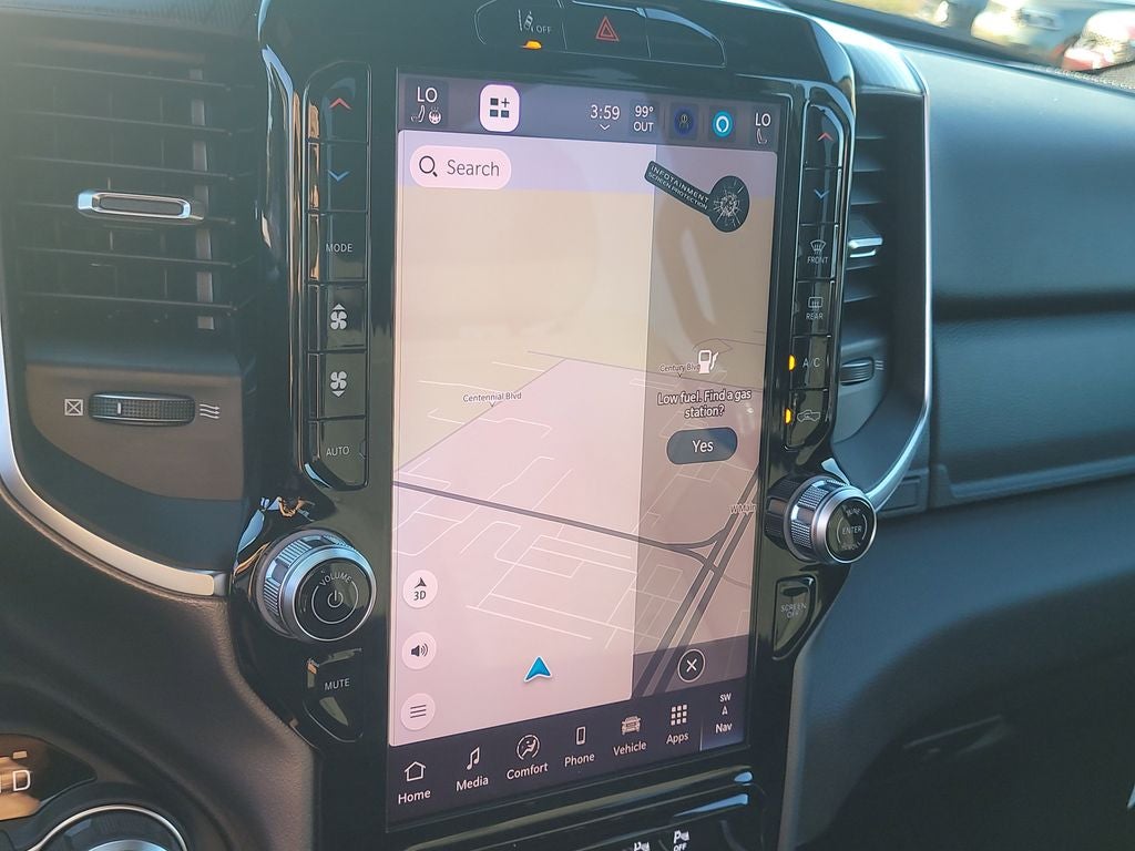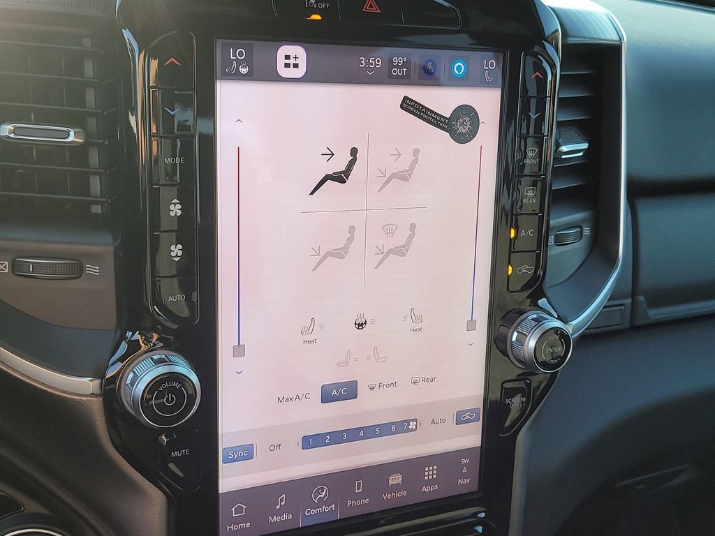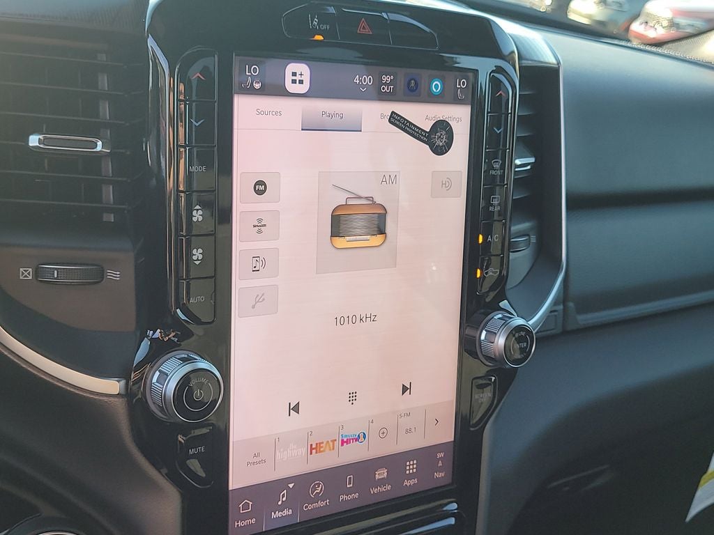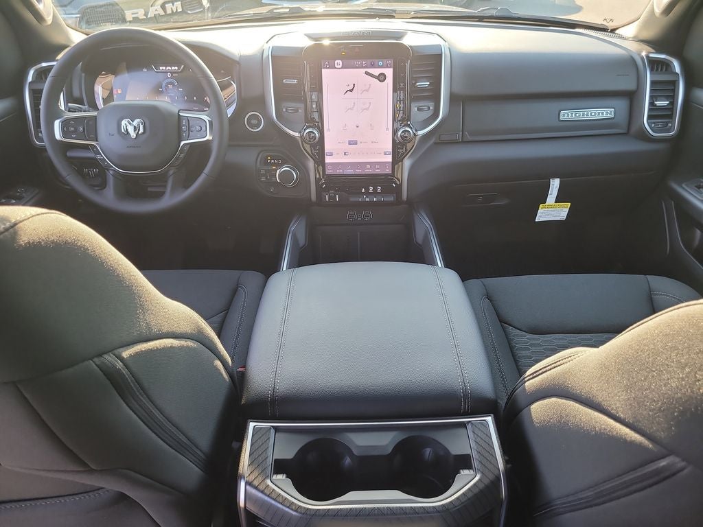 Big Horn Level 2 Equipment Group (115V Auxiliary Power Outlet, 115V Auxiliary Rear Power Outlet, 12 Touchscreen Display, 2nd Row in Floor Storage Bins, 3 Rear Seat Head Restraints, 4 Way Front Headrests, 400W Inverter, 4G LTE Wi-Fi Hot Spot, 9 Amplified Speakers with Subwoofer, Air Conditioning ATC with Dual Zone Control, Apple CarPlay, Auto Power-Folding Mirrors, Auto-Dimming Exterior Driver Mirror, Auto-Dimming Rear-View Mirror, Black Exterior Mirrors, Black Premium Power Mirrors, Body Color Fender Flares, Bucket Seats, Center Console Parts Module, Cluster 7.0 TFT Color Display, Configurable Drive Mode, Connected Travel and Traffic Services, Connectivity - US/Canada, Convex Wide-Angle Exterior Mirror Insert, Deluxe Cloth Bucket Seats, Disassociated Touchscreen Display, Exterior Mirrors Courtesy Lamps, Exterior Mirrors with Heating Element, Exterior Mirrors with Supplemental Signals, Front Seat Back Map Pockets, Full Length Floor Console, Global Telematics Box Module, Glove Box Lamp, Google Android Auto, GPS Antenna Input, GPS Navigation, HD Radio, Heated Front Seats, Heated Steering Wheel, Integrated Center Stack Radio, Integrated Voice Command with Bluetooth®, Leather Wrapped Steering Wheel, LED Dome Lamp with on/Off Switch, LED Footwell Lighting, Manual Adjust 4-Way Front Passenger Seat, Media Hub with 2 Charge Only USBs, Overhead LED Lamps, Power 2-Way Driver Lumbar Adjust, Power Adjust 8-Way Driver Seat, Power Adjustable Pedals, Premium Overhead Console, Radio: Uconnect 5 Navigation with 12.0 Display, Rear 60/40 Folding Seat, Rear Center Armrest, Rear Power Sliding Window, Rear Window Defroster, Remote Tailgate Release, Security Alarm, SiriusXM Radio Service, SiriusXM with 360L, Steering Wheel Mounted Audio Controls, Sun Visors with Illuminated Vanity Mirrors, Universal Garage Door Opener, and USB Host Flip), Night Edition (Accent Color Door Handles, Accent Color Premium Power Mirrors, Accent Color Tailgate Handle, Anti-Spin Differential Rear Axle, Black Exterior Truck Badging, Black Headlamp Bezels, Black Interior Accents, Black Painted Exterior Mirrors Caps, Black Tail Lamp Bezels, Body Color Front Bumper, Body Color Rear Bumper with Step Pads, Dual Exhaust with Black Tips, Grille Black Surround Black Mesh, RAM Grille Badge - Black, and Wheels: 20 x 9.0 Aluminum Painted Clad), Quick Order Package 21Z Big Horn, 4-Wheel Disc Brakes, 48V Belt Starter Generator, 6 Speakers, ABS brakes, Air Conditioning, Alloy wheels, AM/FM radio, Apple CarPlay/Android Auto, Auto High-beam Headlights, Brake assist, Bumpers: chrome, Cloth Bucket Seats, Cluster 12 TFT Color Display, Compass, Delay-off headlights, Driver door bin, Dual front impact airbags, Dual front side impact airbags, Electronic Stability Control, Front anti-roll bar, Front Bucket Seats, Front Center Armrest w/Storage, Front fog lights, Front reading lights, Front wheel independent suspension, Fully automatic headlights, Heated door mirrors, Illuminated entry, Low tire pressure warning, Manual Adjust 4-Way Driver Seat, Manual Folding Exterior Mirrors, MOPAR Front and Rear Rubber Floor Mats, Occupant sensing airbag, Outside temperature display, Overhead airbag, Overhead console, Panic alarm, ParkView Rear Back-Up Camera, Passenger door bin, Passenger vanity mirror, Power door mirrors, Power steering, Power windows, Radio data system, Radio: Uconnect 5 W with 8.4 Display, RAM Grille Badge - Chrome, Rear anti-roll bar, Rear step bumper, Rear Wheelhouse Liners, Remote keyless entry, Speed control, Supplier Part Tracking (J-1), Tachometer, Telescoping steering wheel, Tilt steering wheel, Traction control, Trailer Brake Control, Trip computer, Variably intermittent wipers, and Voltmeter.