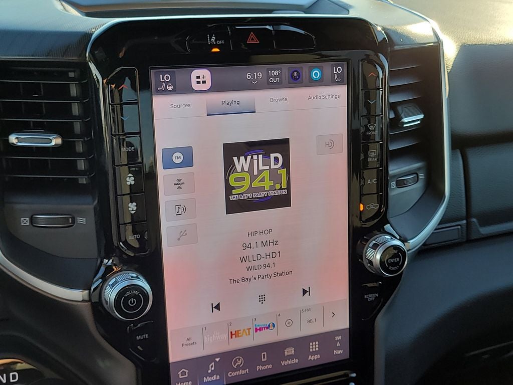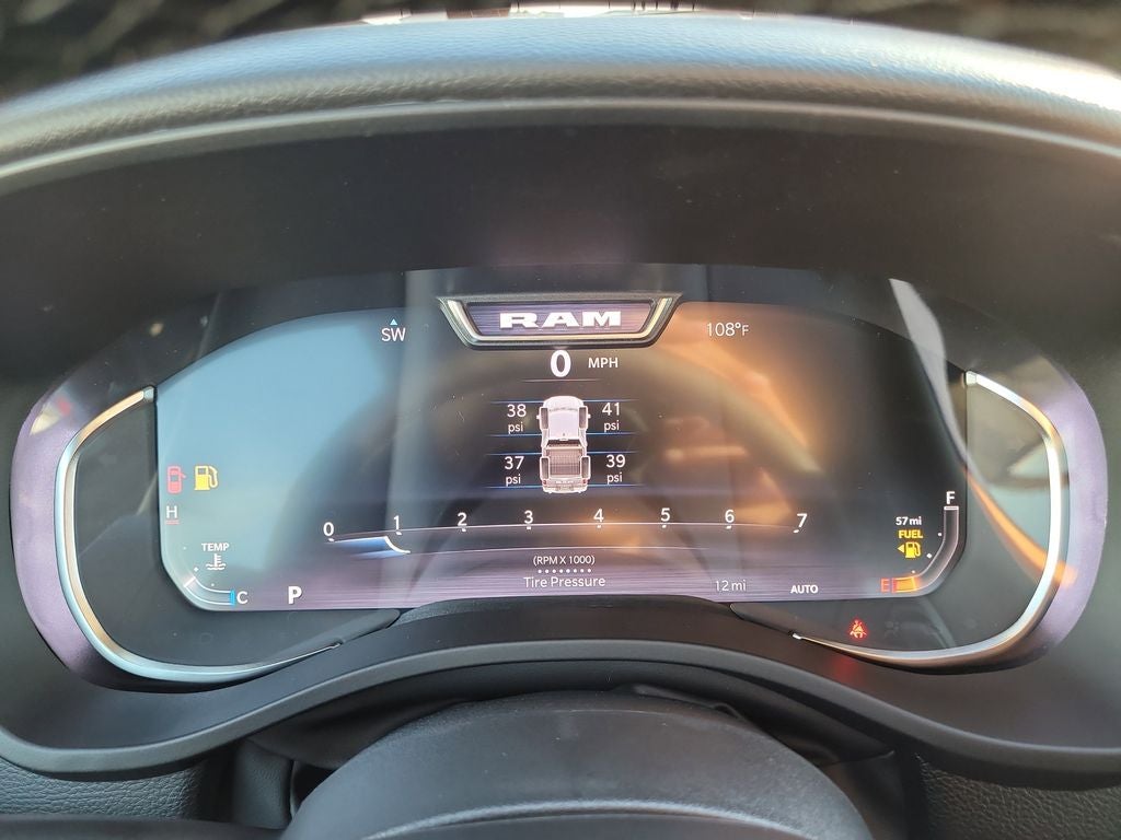 Big Horn Level 2 Equipment Group (115V Auxiliary Power Outlet, 115V Auxiliary Rear Power Outlet, 12 Touchscreen Display, 2nd Row in Floor Storage Bins, 3 Rear Seat Head Restraints, 4 Way Front Headrests, 400W Inverter, 4G LTE Wi-Fi Hot Spot, 9 Amplified Speakers with Subwoofer, Air Conditioning ATC with Dual Zone Control, Apple CarPlay, Auto Power-Folding Mirrors, Auto-Dimming Exterior Driver Mirror, Auto-Dimming Rear-View Mirror, Black Exterior Mirrors, Black Premium Power Mirrors, Body Color Fender Flares, Bucket Seats, Center Console Parts Module, Cluster 7.0 TFT Color Display, Configurable Drive Mode, Connected Travel and Traffic Services, Connectivity - US/Canada, Convex Wide-Angle Exterior Mirror Insert, Deluxe Cloth Bucket Seats, Disassociated Touchscreen Display, Exterior Mirrors Courtesy Lamps, Exterior Mirrors with Heating Element, Exterior Mirrors with Supplemental Signals, Front Seat Back Map Pockets, Full Length Floor Console, Global Telematics Box Module, Glove Box Lamp, Google Android Auto, GPS Antenna Input, GPS Navigation, HD Radio, Heated Front Seats, Heated Steering Wheel, Integrated Center Stack Radio, Integrated Voice Command with Bluetooth®, Leather Wrapped Steering Wheel, LED Dome Lamp with on/Off Switch, LED Footwell Lighting, Manual Adjust 4-Way Front Passenger Seat, Media Hub with 2 Charge Only USBs, Overhead LED Lamps, Power 2-Way Driver Lumbar Adjust, Power Adjust 8-Way Driver Seat, Power Adjustable Pedals, Premium Overhead Console, Radio: Uconnect 5 Navigation with 12.0 Display, Rear 60/40 Folding Seat, Rear Center Armrest, Rear Power Sliding Window, Rear Window Defroster, Remote Tailgate Release, Security Alarm, SiriusXM Radio Service, SiriusXM with 360L, Steering Wheel Mounted Audio Controls, Sun Visors with Illuminated Vanity Mirrors, Universal Garage Door Opener, and USB Host Flip), Night Edition (Accent Color Door Handles, Accent Color Premium Power Mirrors, Accent Color Tailgate Handle, Anti-Spin Differential Rear Axle, Black Exterior Truck Badging, Black Headlamp Bezels, Black Interior Accents, Black Painted Exterior Mirrors Caps, Black Tail Lamp Bezels, Body Color Front Bumper, Body Color Rear Bumper with Step Pads, Dual Exhaust with Black Tips, Grille Black Surround Black Mesh, RAM Grille Badge - Black, and Wheels: 20 x 9.0 Aluminum Painted Clad), Quick Order Package 21Z Big Horn, 4-Wheel Disc Brakes, 48V Belt Starter Generator, 6 Speakers, ABS brakes, Air Conditioning, Alloy wheels, AM/FM radio, Apple CarPlay/Android Auto, Auto High-beam Headlights, Brake assist, Bumpers: chrome, Cloth Bucket Seats, Cluster 12 TFT Color Display, Compass, Delay-off headlights, Driver door bin, Dual front impact airbags, Dual front side impact airbags, Electronic Stability Control, Front anti-roll bar, Front Bucket Seats, Front Center Armrest w/Storage, Front fog lights, Front reading lights, Front wheel independent suspension, Fully automatic headlights, Heated door mirrors, Illuminated entry, Low tire pressure warning, Manual Adjust 4-Way Driver Seat, Manual Folding Exterior Mirrors, MOPAR Front and Rear Rubber Floor Mats, Occupant sensing airbag, Outside temperature display, Overhead airbag, Overhead console, Panic alarm, ParkView Rear Back-Up Camera, Passenger door bin, Passenger vanity mirror, Power door mirrors, Power steering, Power windows, Radio data system, Radio: Uconnect 5 W with 8.4 Display, RAM Grille Badge - Chrome, Rear anti-roll bar, Rear step bumper, Rear Wheelhouse Liners, Remote keyless entry, Speed control, Supplier Part Tracking (J-1), Tachometer, Telescoping steering wheel, Tilt steering wheel, Traction control, Trailer Brake Control, Trip computer, Variably intermittent wipers, and Voltmeter.