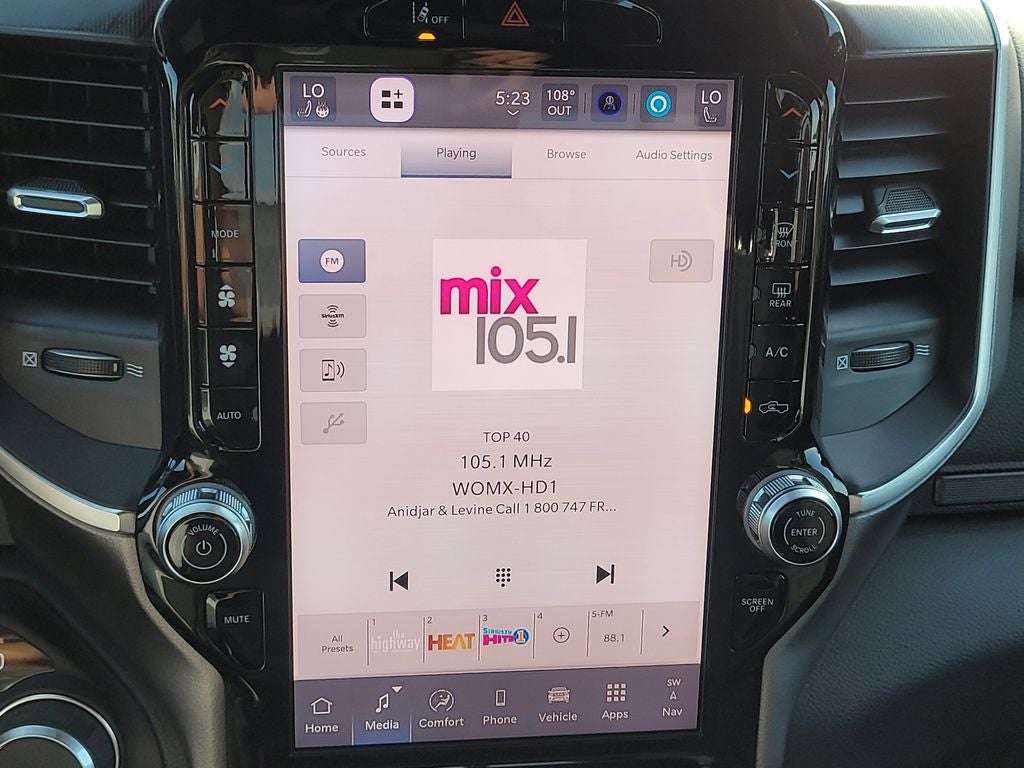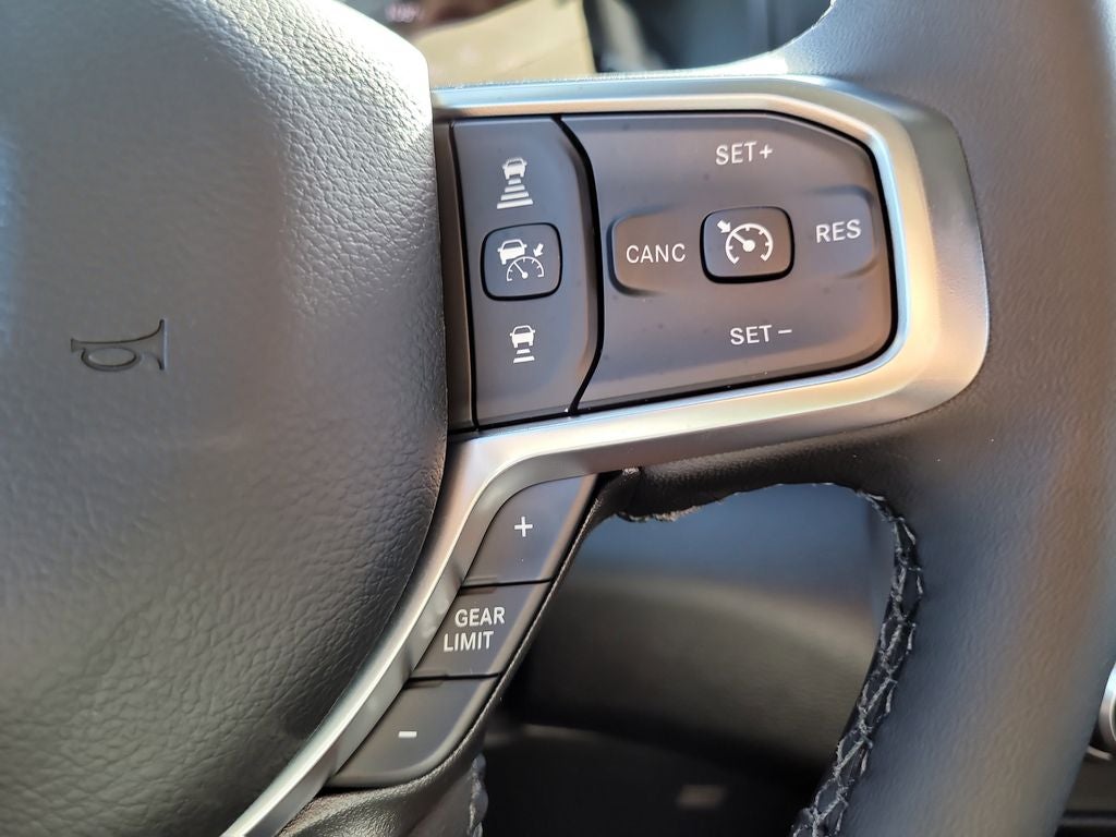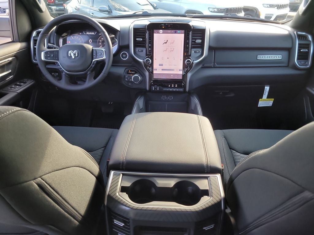 Big Horn Level 2 Equipment Group (115V Auxiliary Power Outlet, 115V Auxiliary Rear Power Outlet, 12 Touchscreen Display, 2nd Row in Floor Storage Bins, 3 Rear Seat Head Restraints, 4 Way Front Headrests, 400W Inverter, 4G LTE Wi-Fi Hot Spot, 9 Amplified Speakers with Subwoofer, Air Conditioning ATC with Dual Zone Control, Apple CarPlay, Auto Power-Folding Mirrors, Auto-Dimming Exterior Driver Mirror, Auto-Dimming Rear-View Mirror, Black Exterior Mirrors, Black Premium Power Mirrors, Body Color Fender Flares, Bucket Seats, Center Console Parts Module, Cluster 7.0 TFT Color Display, Configurable Drive Mode, Connected Travel and Traffic Services, Connectivity - US/Canada, Convex Wide-Angle Exterior Mirror Insert, Deluxe Cloth Bucket Seats, Disassociated Touchscreen Display, Exterior Mirrors Courtesy Lamps, Exterior Mirrors with Heating Element, Exterior Mirrors with Supplemental Signals, Front Seat Back Map Pockets, Full Length Floor Console, Global Telematics Box Module, Glove Box Lamp, Google Android Auto, GPS Antenna Input, GPS Navigation, HD Radio, Heated Front Seats, Heated Steering Wheel, Integrated Center Stack Radio, Integrated Voice Command with Bluetooth®, Leather Wrapped Steering Wheel, LED Dome Lamp with on/Off Switch, LED Footwell Lighting, Manual Adjust 4-Way Front Passenger Seat, Media Hub with 2 Charge Only USBs, Overhead LED Lamps, Power 2-Way Driver Lumbar Adjust, Power Adjust 8-Way Driver Seat, Power Adjustable Pedals, Premium Overhead Console, Radio: Uconnect 5 Navigation with 12.0 Display, Rear 60/40 Folding Seat, Rear Center Armrest, Rear Power Sliding Window, Rear Window Defroster, Remote Tailgate Release, Security Alarm, SiriusXM Radio Service, SiriusXM with 360L, Steering Wheel Mounted Audio Controls, Sun Visors with Illuminated Vanity Mirrors, Universal Garage Door Opener, and USB Host Flip), Night Edition (Accent Color Door Handles, Accent Color Premium Power Mirrors, Accent Color Tailgate Handle, Anti-Spin Differential Rear Axle, Black Exterior Truck Badging, Black Headlamp Bezels, Black Interior Accents, Black Painted Exterior Mirrors Caps, Black Tail Lamp Bezels, Body Color Front Bumper, Body Color Rear Bumper with Step Pads, Dual Exhaust with Black Tips, Grille Black Surround Black Mesh, RAM Grille Badge - Black, and Wheels: 20 x 9.0 Aluminum Painted Clad), Quick Order Package 21Z Big Horn, 4-Wheel Disc Brakes, 48V Belt Starter Generator, 6 Speakers, ABS brakes, Air Conditioning, Alloy wheels, AM/FM radio, Apple CarPlay/Android Auto, Auto High-beam Headlights, Brake assist, Bumpers: chrome, Cloth Bucket Seats, Cluster 12 TFT Color Display, Compass, Delay-off headlights, Driver door bin, Dual front impact airbags, Dual front side impact airbags, Electronic Stability Control, Front anti-roll bar, Front Bucket Seats, Front Center Armrest w/Storage, Front fog lights, Front reading lights, Front wheel independent suspension, Fully automatic headlights, Heated door mirrors, Illuminated entry, Low tire pressure warning, Manual Adjust 4-Way Driver Seat, Manual Folding Exterior Mirrors, MOPAR Front and Rear Rubber Floor Mats, Occupant sensing airbag, Outside temperature display, Overhead airbag, Overhead console, Panic alarm, ParkView Rear Back-Up Camera, Passenger door bin, Passenger vanity mirror, Power door mirrors, Power steering, Power windows, Radio data system, Radio: Uconnect 5 W with 8.4 Display, RAM Grille Badge - Chrome, Rear anti-roll bar, Rear step bumper, Rear Wheelhouse Liners, Remote keyless entry, Speed control, Supplier Part Tracking (J-1), Tachometer, Telescoping steering wheel, Tilt steering wheel, Traction control, Trailer Brake Control, Trip computer, Variably intermittent wipers, and Voltmeter.