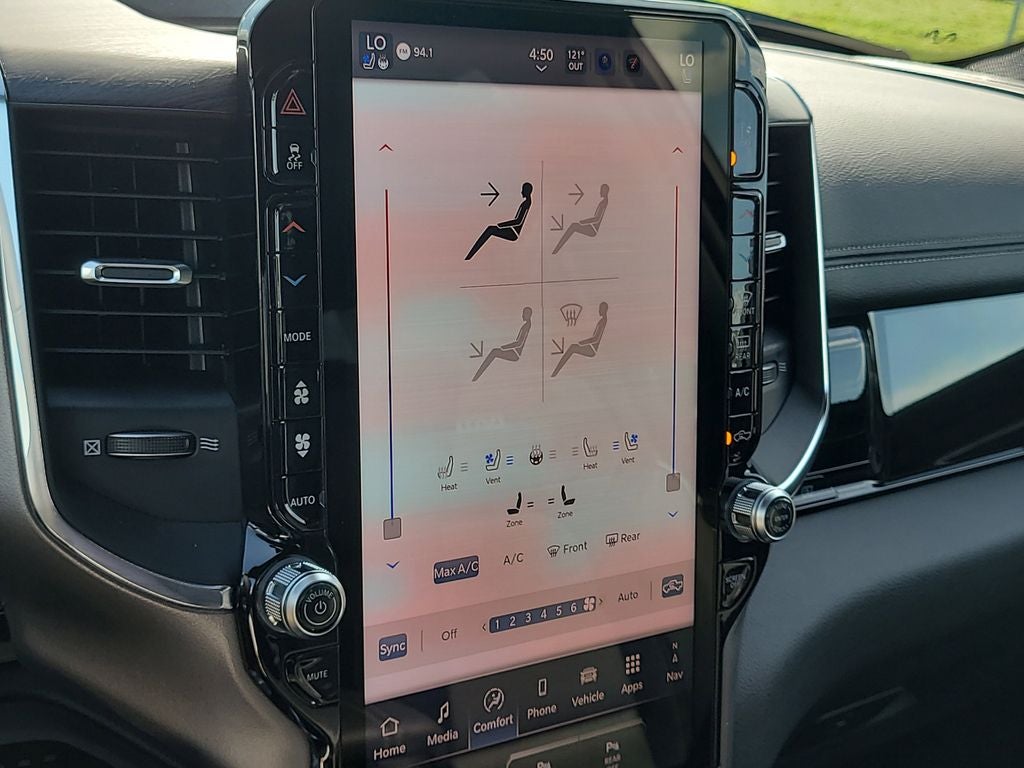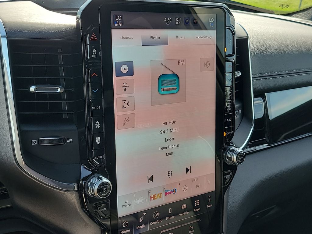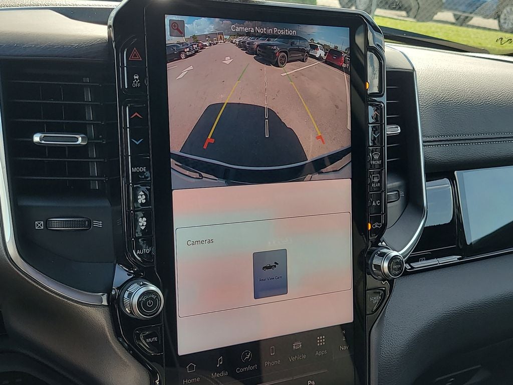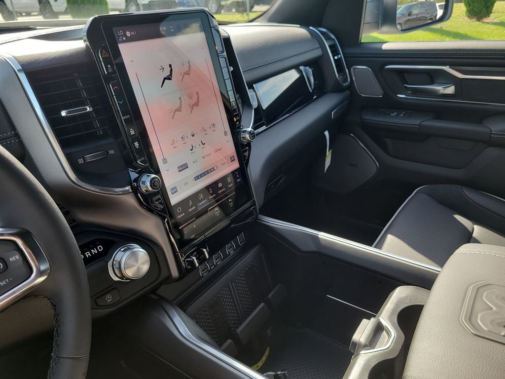 Bed Utility Group (Exterior 115V AC Outlet, MOPAR 4 Adjustable Cargo Tie-Down Hooks, and MOPAR Spray in Bedliner), Laramie Level 2 Equipment Group (14.4 Touchscreen Display, 4G LTE Wi-Fi Hot Spot, Cluster 12 TFT Color Display, Connected Travel and Traffic Services, Connectivity - US/Canada, Front Passenger Interactive Display, GPS Navigation, Harman/Kardon 19 Speaker Premium Sound, Integrated Center Stack Radio, Integrated Voice Command with Bluetooth®, Power Tailgate, Radio: Uconnect 5 Nav with 14.4 Display, Rain Sensitive Windshield Wipers, SiriusXM Radio Service, SiriusXM with 360L, and USB Host Flip), Quick Order Package 21H Laramie, Sport Appearance Package (Accent Color Premium Power Mirrors, Auto Power-Folding Mirrors, Auto-Dimming Exterior Driver Mirror, Black Interior Accents, Black Painted Exterior Mirrors Caps, Body Color Front Bumper, Body Color Rear Bumper with Step Pads, Bridgestone Brand Tires, Convex Wide-Angle Exterior Mirror Insert, Exterior Mirrors Courtesy Lamps, Exterior Mirrors with Heating Element, Exterior Mirrors with Memory, Exterior Mirrors with Supplemental Signals, Grille Surround 3 Body Color Tex 2 Black, RAM Grille Badge - Chrome, and Sport Performance Hood), 10 Speakers, 4-Wheel Disc Brakes, ABS brakes, Air Conditioning, Alloy wheels, AM/FM radio: SiriusXM with 360L, Anti-Spin Differential Rear Axle, Apple CarPlay/Android Auto, Audio memory, Auto High-beam Headlights, Auto-dimming door mirrors, Auto-dimming Rear-View mirror, Automatic temperature control, Brake assist, Bumpers: chrome, Chrome Exterior Mirrors, Compass, Delay-off headlights, Driver door bin, Driver vanity mirror, Dual front impact airbags, Dual front side impact airbags, Electronic Stability Control, Exterior Parking Camera Rear, Front anti-roll bar, Front Bucket Seats, Front Center Armrest w/Storage, Front dual zone A/C, Front fog lights, Front License Plate Bracket, Front reading lights, Front wheel independent suspension, Fully automatic headlights, Garage door transmitter, Heated door mirrors, Heated front seats, Heated rear seats, Heated steering wheel, Illuminated entry, Leather steering wheel, Leather Trimmed Bucket Seats, Low tire pressure warning, Manufacturer's Statement of Origin, Memory seat, MOPAR Front and Rear Rubber Floor Mats, Navigation System, Occupant sensing airbag, Outside temperature display, Overhead airbag, Overhead console, Panic alarm, Passenger door bin, Passenger vanity mirror, Pirelli Brand Tires, Power door mirrors, Power driver seat, Power passenger seat, Power steering, Power windows, Radio data system, Radio: Uconnect 5 Navigation with 12.0 Display, Rear anti-roll bar, Rear reading lights, Rear seat center armrest, Rear step bumper, Remote keyless entry, Security system, Speed control, Split folding rear seat, Steering wheel mounted audio controls, Tachometer, Telescoping steering wheel, Tilt steering wheel, Traction control, Trailer Brake Control, Trip computer, Turn signal indicator mirrors, Variably intermittent wipers, Ventilated front seats, Voltmeter, Wheels: 20 x 9 Premium Paint/Polish, and Wheels: 22 x 9 Forged Aluminum.