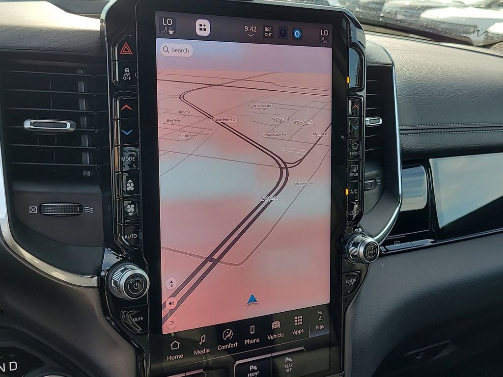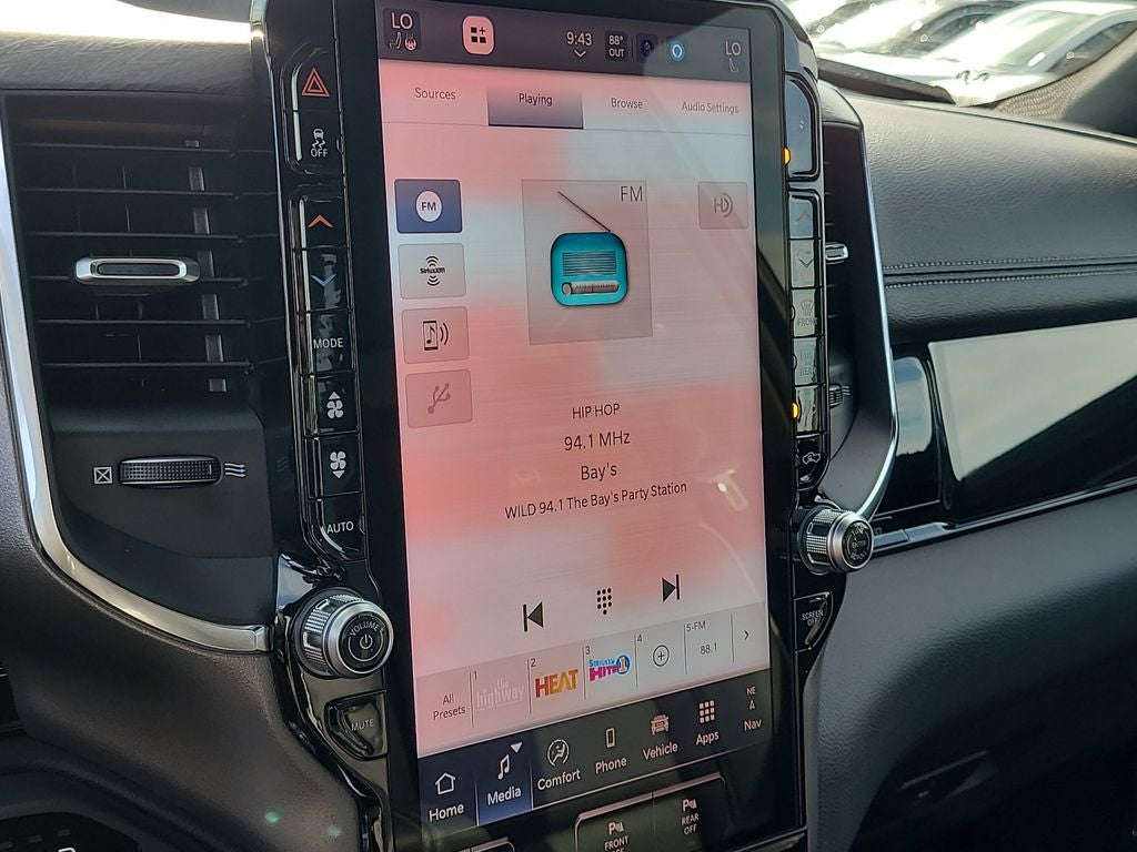 Bed Utility Group (Exterior 115V AC Outlet, MOPAR 4 Adjustable Cargo Tie-Down Hooks, and MOPAR Spray in Bedliner), Laramie Level 2 Equipment Group (14.4 Touchscreen Display, 4G LTE Wi-Fi Hot Spot, Cluster 12 TFT Color Display, Connected Travel and Traffic Services, Connectivity - US/Canada, Front Passenger Interactive Display, GPS Navigation, Harman/Kardon 19 Speaker Premium Sound, Integrated Center Stack Radio, Integrated Voice Command with Bluetooth®, Power Tailgate, Radio: Uconnect 5 Nav with 14.4 Display, Rain Sensitive Windshield Wipers, SiriusXM Radio Service, SiriusXM with 360L, and USB Host Flip), Quick Order Package 21H Laramie, Sport Appearance Package (Accent Color Premium Power Mirrors, Auto Power-Folding Mirrors, Auto-Dimming Exterior Driver Mirror, Black Interior Accents, Black Painted Exterior Mirrors Caps, Body Color Front Bumper, Body Color Rear Bumper with Step Pads, Bridgestone Brand Tires, Convex Wide-Angle Exterior Mirror Insert, Exterior Mirrors Courtesy Lamps, Exterior Mirrors with Heating Element, Exterior Mirrors with Memory, Exterior Mirrors with Supplemental Signals, Grille Surround 3 Body Color Tex 2 Black, RAM Grille Badge - Chrome, and Sport Performance Hood), 10 Speakers, 4-Wheel Disc Brakes, ABS brakes, Air Conditioning, Alloy wheels, AM/FM radio: SiriusXM with 360L, Anti-Spin Differential Rear Axle, Apple CarPlay/Android Auto, Audio memory, Auto High-beam Headlights, Auto-dimming door mirrors, Auto-dimming Rear-View mirror, Automatic temperature control, Brake assist, Bumpers: chrome, Chrome Exterior Mirrors, Compass, Delay-off headlights, Driver door bin, Driver vanity mirror, Dual front impact airbags, Dual front side impact airbags, Electronic Stability Control, Exterior Parking Camera Rear, Front anti-roll bar, Front Bucket Seats, Front Center Armrest w/Storage, Front dual zone A/C, Front fog lights, Front License Plate Bracket, Front reading lights, Front wheel independent suspension, Fully automatic headlights, Garage door transmitter, Heated door mirrors, Heated front seats, Heated rear seats, Heated steering wheel, Illuminated entry, Leather steering wheel, Leather Trimmed Bucket Seats, Low tire pressure warning, Manufacturer's Statement of Origin, Memory seat, MOPAR Front and Rear Rubber Floor Mats, Navigation System, Occupant sensing airbag, Outside temperature display, Overhead airbag, Overhead console, Panic alarm, Passenger door bin, Passenger vanity mirror, Pirelli Brand Tires, Power door mirrors, Power driver seat, Power passenger seat, Power steering, Power windows, Radio data system, Radio: Uconnect 5 Navigation with 12.0 Display, Rear anti-roll bar, Rear reading lights, Rear seat center armrest, Rear step bumper, Remote keyless entry, Security system, Speed control, Split folding rear seat, Steering wheel mounted audio controls, Tachometer, Telescoping steering wheel, Tilt steering wheel, Traction control, Trailer Brake Control, Trip computer, Turn signal indicator mirrors, Variably intermittent wipers, Ventilated front seats, Voltmeter, Wheels: 20 x 9 Premium Paint/Polish, and Wheels: 22 x 9 Forged Aluminum.