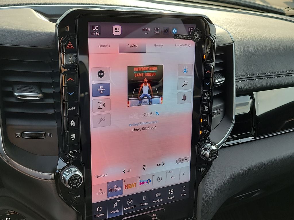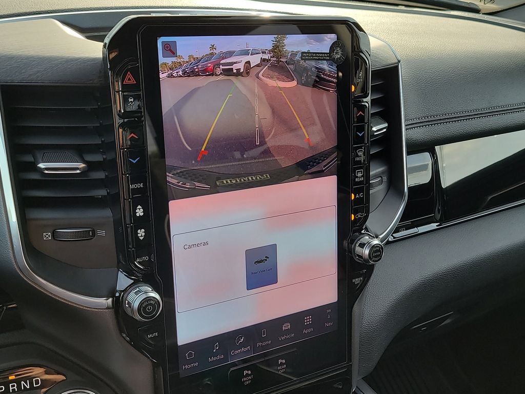 Laramie Level 2 Equipment Group (14.4 Touchscreen Display, 4G LTE Wi-Fi Hot Spot, Cluster 12 TFT Color Display, Connected Travel and Traffic Services, Connectivity - US/Canada, Front Passenger Interactive Display, GPS Navigation, Harman/Kardon 19 Speaker Premium Sound, Integrated Center Stack Radio, Integrated Voice Command with Bluetooth®, Power Tailgate, Radio: Uconnect 5 Nav with 14.4 Display, Rain Sensitive Windshield Wipers, SiriusXM Radio Service, SiriusXM with 360L, and USB Host Flip), Quick Order Package 21H Laramie, Sport Appearance Package (Accent Color Premium Power Mirrors, Auto Power-Folding Mirrors, Auto-Dimming Exterior Driver Mirror, Black Interior Accents, Black Painted Exterior Mirrors Caps, Body Color Front Bumper, Body Color Rear Bumper with Step Pads, Bridgestone Brand Tires, Convex Wide-Angle Exterior Mirror Insert, Exterior Mirrors Courtesy Lamps, Exterior Mirrors with Heating Element, Exterior Mirrors with Memory, Exterior Mirrors with Supplemental Signals, Grille Surround 3 Body Color Tex 2 Black, RAM Grille Badge - Chrome, and Sport Performance Hood), 10 Speakers, 4-Wheel Disc Brakes, ABS brakes, Air Conditioning, Alloy wheels, AM/FM radio: SiriusXM with 360L, Anti-Spin Differential Rear Axle, Apple CarPlay/Android Auto, Audio memory, Auto High-beam Headlights, Auto-dimming door mirrors, Auto-dimming Rear-View mirror, Automatic temperature control, Brake assist, Bumpers: chrome, Chrome Exterior Mirrors, Compass, Delay-off headlights, Driver door bin, Driver vanity mirror, Dual front impact airbags, Dual front side impact airbags, Electronic Stability Control, Exterior Parking Camera Rear, Front anti-roll bar, Front Bucket Seats, Front Center Armrest w/Storage, Front dual zone A/C, Front fog lights, Front reading lights, Front wheel independent suspension, Fully automatic headlights, Garage door transmitter, Heated door mirrors, Heated front seats, Heated rear seats, Heated steering wheel, Illuminated entry, Leather steering wheel, Leather Trimmed Bucket Seats, Low tire pressure warning, Memory seat, MOPAR Front and Rear Rubber Floor Mats, Navigation System, Occupant sensing airbag, Outside temperature display, Overhead airbag, Overhead console, Panic alarm, Passenger door bin, Passenger vanity mirror, Power door mirrors, Power driver seat, Power passenger seat, Power steering, Power windows, Radio data system, Radio: Uconnect 5 Navigation with 12.0 Display, Rear anti-roll bar, Rear reading lights, Rear seat center armrest, Rear step bumper, Remote keyless entry, Security system, Speed control, Split folding rear seat, Steering wheel mounted audio controls, Tachometer, Telescoping steering wheel, Tilt steering wheel, Traction control, Trip computer, Turn signal indicator mirrors, Variably intermittent wipers, Ventilated front seats, Voltmeter, and Wheels: 20 x 9 Premium Paint/Polish.