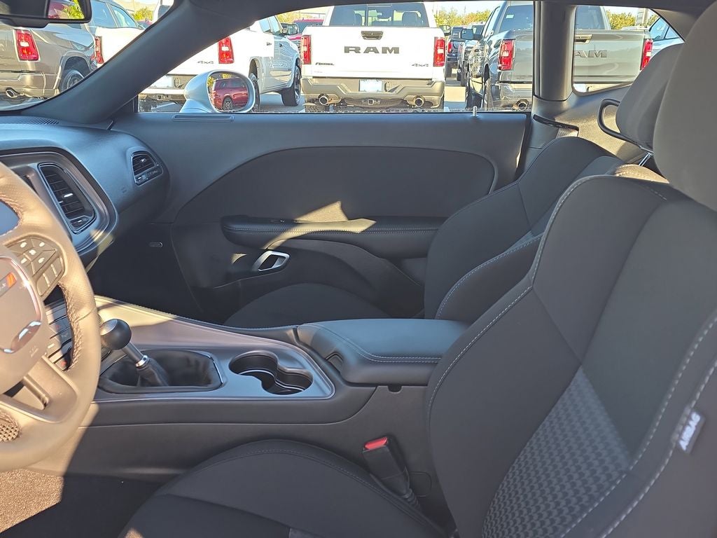 Blacktop Package (Black Fuel Filler Door, Black Grille w/Bezel, Blacktop R/T Badge, Challenger Blacktop Grille Badge, Gloss Black I/P Cluster Trim Rings, Rhombi 2-Pc Wheel Center Cap, Satin Black Dodge Tail Lamp Badge, and Wheels: 20 x 8.0 Black Noise Painted), Quick Order Package 22H, Challenger R/T, 2D Coupe, HEMI 5.7L V8 VVT, Tremec 6-Speed Manual, RWD, Triple Nickel Clearcoat, Black Cloth, 276 Watt Amplifier, 4-Wheel Disc Brakes, 6 Speakers, ABS brakes, Air Conditioning, Alloy wheels, AM/FM radio, Anti-whiplash front head restraints, Apple CarPlay, Apple CarPlay/Android Auto, Auto-dimming Rear-View mirror, Automatic temperature control, Body Color Exterior Mirrors, Brake assist, Bumpers: body-color, Delay-off headlights, Driver door bin, Driver vanity mirror, Dual front impact airbags, Dual front side impact airbags, Electronic Stability Control, Exterior Mirrors w/Heating Element, Four wheel independent suspension, Front anti-roll bar, Front Bucket Seats, Front Center Armrest, Front dual zone A/C, Front License Plate Bracket, Front reading lights, Fully automatic headlights, Garage door transmitter, Google Android Auto, GPS Antenna Input, Heated door mirrors, Houndstooth Cloth Performance Seats, Illuminated entry, Integrated Center Stack Radio, Integrated Voice Command w/Bluetooth®, Leather Shift Knob, Low tire pressure warning, Media Hub (2 USB, AUX), Outside temperature display, Overhead airbag, Overhead console, Panic alarm, ParkView Rear Back-Up Camera, Passenger door bin, Passenger vanity mirror, Power door mirrors, Power driver seat, Power steering, Power windows, Radio data system, Radio: Uconnect 4 w/7 Display, Rear anti-roll bar, Rear reading lights, Rear seat center armrest, Rear window defroster, Remote keyless entry, Security system, Speed control, Speed-sensing steering, Split folding rear seat, Spoiler, Sport steering wheel, Steering wheel mounted audio controls, Tachometer, Telescoping steering wheel, Tilt steering wheel, Traction control, Trip computer, USB Host Flip, Variably intermittent wipers, and Wheels: 20 x 8.0 Machined w/Granite Pocket.