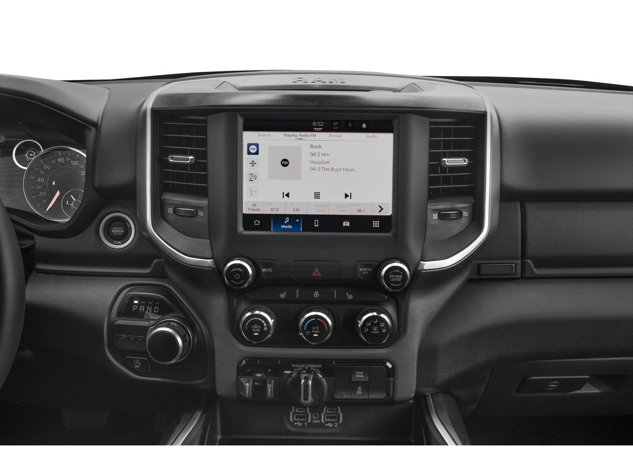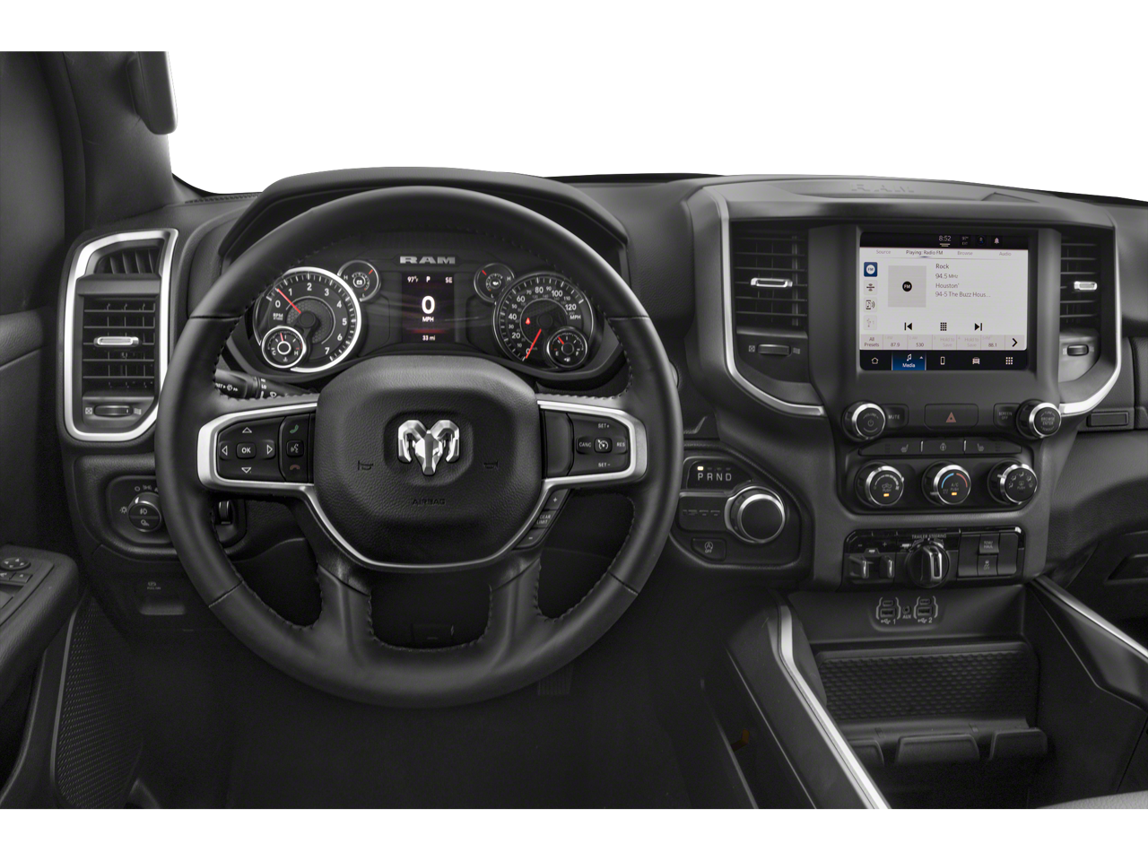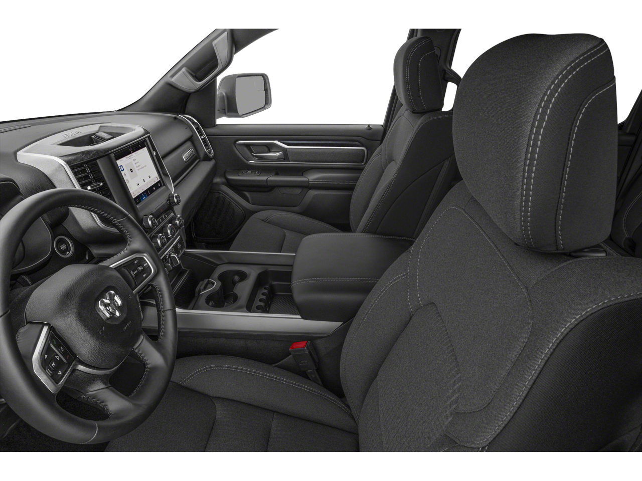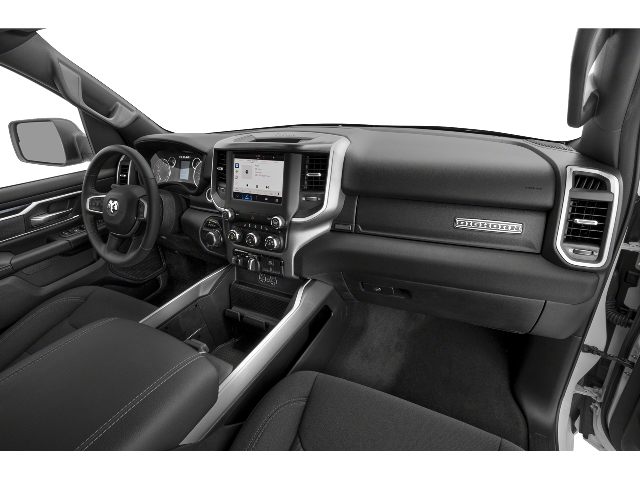 Big Horn Level 1 Equipment Group (2nd Row In Floor Storage Bins, 4G LTE Wi-Fi Hot Spot, Apple CarPlay, Auto-Dimming Exterior Driver Mirror, Auto-Dimming Rear-View Mirror, Black Premium Power Mirrors, Bluetooth® Handsfree Phone & Audio, Class IV Receiver Hitch, Connectivity - US/Canada, Convex Wide-Angle Exterior Mirror Insert, Exterior Mirrors Courtesy Lamps, Exterior Mirrors w/Heating Element, Exterior Mirrors w/Supplemental Signals, For Details, Visit DriveUconnect.com, For More Info, Call 800-643-2112, Front Fog Lamps, Global Telematics Box Module (TBM), Glove Box Lamp, Google Android Auto, Heated Front Seats, Heated Steering Wheel, Passenger Sun Visor w/Illuminated Mirror, Power-Folding Mirrors, Radio: Uconnect 5 W w/8.4 Display, Rear Dome w/On/Off Switch Lamp, Rear Power Sliding Window, Rear Window Defroster, SiriusXM Radio Service, SiriusXM Satellite Radio, and USB Host Flip), Quick Order Package 23Z Big Horn, Quick Order Package 27Z Big Horn, Sport Appearance Package (3 Rear Seat Head Restraints, 4 Way Front Headrests, Black Interior Accents, Body Color Door Handles, Body Color Exterior Mirrors, Body Color Front Bumper, Body Color Premium Power Mirrors, Body Color Rear Bumper w/Step Pads, Bucket Seats, Deluxe Cloth Bucket Seats, Front Seat Back Map Pockets, Full Length Floor Console, Grille Surround 1 Body Color Texture 2 Black, Manual Adjust 4-Way Front Passenger Seat, Power 2-Way Driver Lumbar Adjust, Power 8-Way Driver Seat, RAM Grille Badge - Chrome, Rear 60/40 Folding Seat, and Rear Center Armrest), Trailer Tow Group (Black Trailer Tow Power Mirrors, Trailer Brake Control, Trailer Light Check, Trailer Reverse Steering Control, and Trailer Tire Pressure Monitoring System), 3.21 Rear Axle Ratio, 4-Wheel Disc Brakes, 48V Belt Starter Generator, 6 Speakers, 9 Amplified Speakers w/Subwoofer, ABS brakes, Air Conditioning, Alloy wheels, AM/FM radio, Anti-Spin Differential Rear Axle, Brake assist, Bumpers: chrome, Cloth Bench Seat, Compass, Delay-off headlights, Driver door bin, Dual front impact airbags, Dual front side impact airbags, Electronic Stability Control, Emergency communication system: RAM Connect, Exterior Parking Camera Rear, Front anti-roll bar, Front Center Armrest w/Storage, Front reading lights, Front wheel independent suspension, Fully automatic headlights, Heated door mirrors, Illuminated entry, Integrated Voice Command w/Bluetooth®, Leather steering wheel, Low tire pressure warning, Manufacturer's Statement of Origin, MOPAR Front & Rear Rubber Floor Mats, Occupant sensing airbag, Outside temperature display, Overhead airbag, Overhead console, Panic alarm, Passenger door bin, Passenger vanity mirror, Power door mirrors, Power steering, Power windows, Radio data system, Radio: Uconnect 3 w/5 Display, Rear anti-roll bar, Rear seat center armrest, Rear step bumper, Remote keyless entry, Remote Start System, Speed control, Split folding rear seat, Steering wheel mounted audio controls, Tachometer, Telescoping steering wheel, Tilt steering wheel, Traction control, Trip computer, Variably intermittent wipers, Voltmeter, and Wheels: 18 x 8 Cast-Aluminum PainteD.
